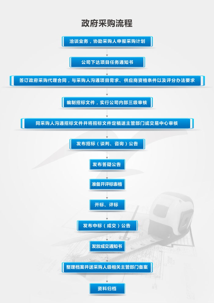 业务范围:全国内各国家机关、事业单位、团体组织或使用财政性资金的货物采购、购买服务以及建筑物和构筑物的新建、改建、扩建、装修、拆除、修缮等工程类项目。