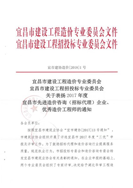 2018年1月9日,在宜昌市建筑业协会组织开展评选宜昌市2017年度“三优”申报的基础上,宜昌市建设工程造价专业委员会和宜昌市建设工程招投标专业委员会组织了专家评审,在此次的专家评审中,我华体会app登录入口-华体会(中国) 脱颖而出,被评为“宜昌市先进造价咨询(招标代理)企业”,同时总经理刘治勇同志被评为“宜昌市优秀造价工程师”。这次评选不仅仅是行业对华体会app登录入口-华体会(中国) 工作上的肯定,更是鼓励我们开拓进取,再创佳绩,为宜昌市的建设做出更多的贡献。