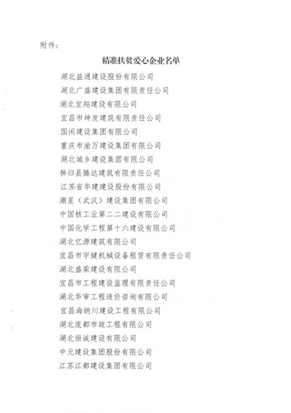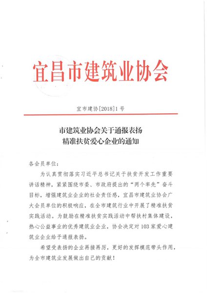 为了认真贯彻落实习近平总书记关于扶贫开发工作重要讲话精神,2018年1月,在宜昌市建筑业协会的号召下,紧紧围绕市委、市政府提出的“两个率先”奋斗目标,华体会app登录入口-华体会(中国) 参与了精准扶贫实践活动。在此次活动中受到协会“爱心企业”表扬。帮扶村集体建设,热心于公益事业,是华体会app登录入口-华体会(中国) 的社会责任。把爱传递,是每个华体会app登录入口-华体会(中国)人的美德。