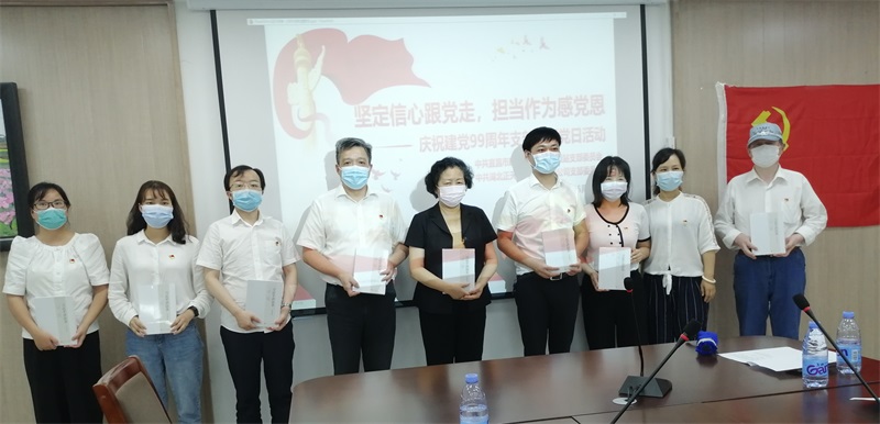 全体党员面对党旗,重温入党誓词,学习交流党章。为六月入党的8位党员过政治生日,并为他们送上了“红色书籍”。各党支部代表发表了政治生日感言,回顾入党经历和政治成长中的工作感悟,感恩党给他们的归属感,肩负党赋予的党员责任,发挥先锋模范带头作用。